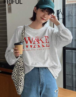 FRIFUL レトロなウェイクアップ フューチャーロゴプリント ドロップショルダーTシャツ(レディース)
