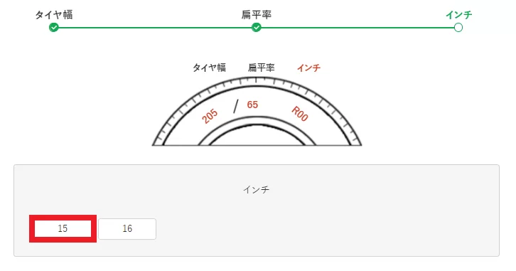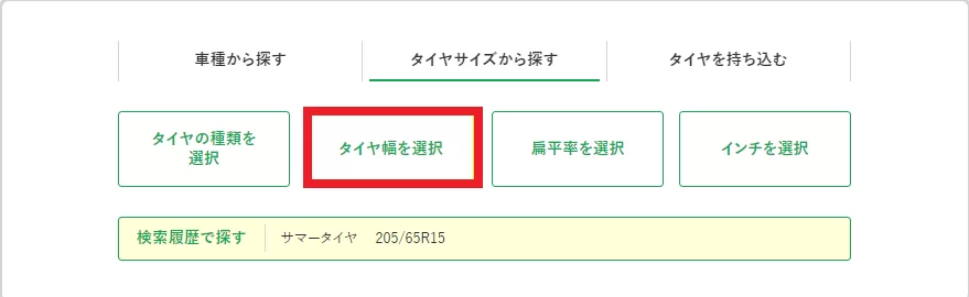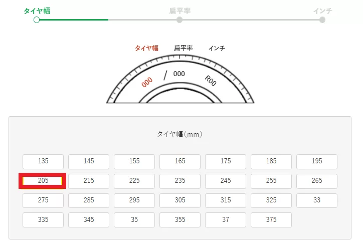 ⇛「タイヤ幅(ここでは例として「205」)」をクリック
