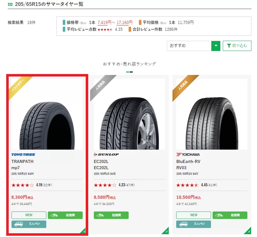⇛「好みのタイヤ(ここでは例として「TOYO TIRES/TRANPATH mp7」)」をクリック