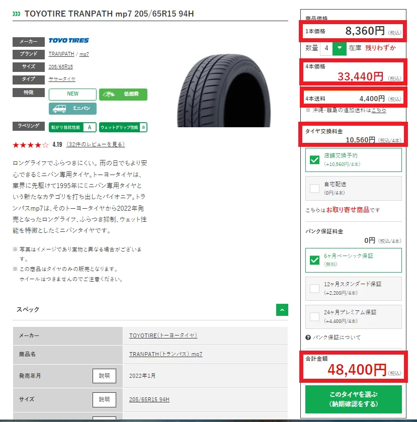 ⑦購入画面から「タイヤ価格」、「送料」、「タイヤ交換料金」を確認