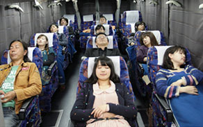 最終乗車地を出発後、乗客の皆さんに車内モニターで説明動画をご覧いただいた後、運転手からアナウンスをして、全ての座席をフルリクライニングしてもらいます。