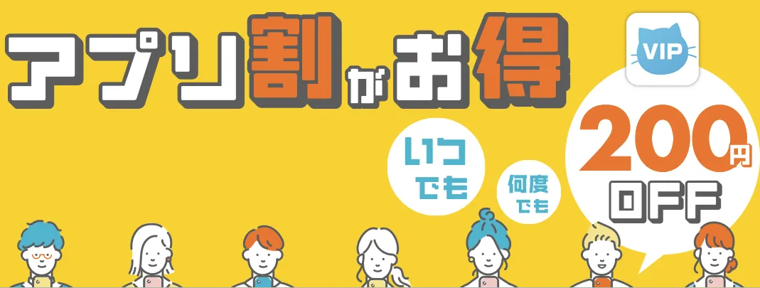 「VIPなアプリ」からのご予約なら、「いつでも」「何度でも」お一人様200円OFFに。