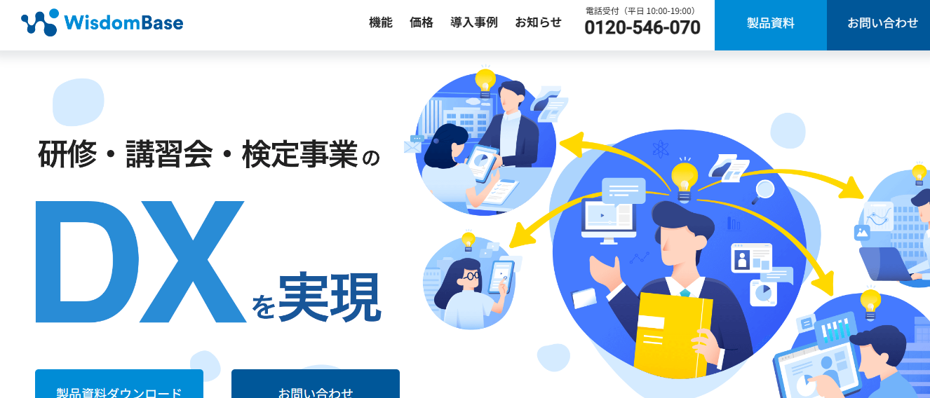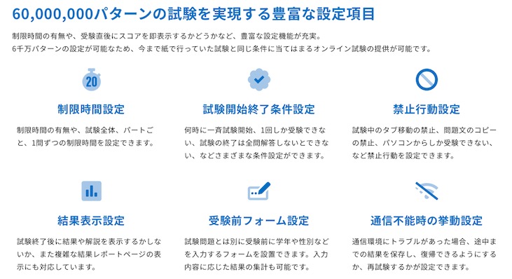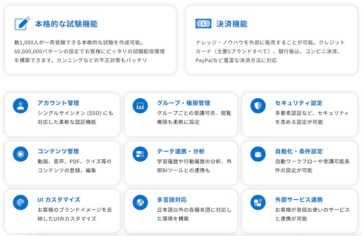 社外向け配信・販売を実現させるための豊富な機能や数千人規模の大試験がオンライン上で行える試験機能などが強みです。
