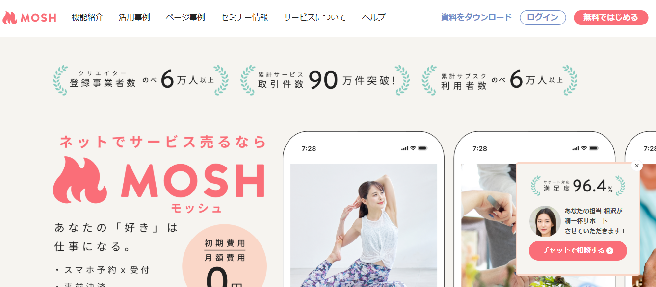 「MOSH」は、ヨガやフィットネスなど小規模サービスを販売する方におすすめのホームページ作成サイトです。初心者やITが苦手という人でもスマートフォンから簡単にホームページを作ることができます。初期費用がかからず、売上が発生した時点で手数料の支払いが発生するため、手軽に使い始められるのが魅力です。